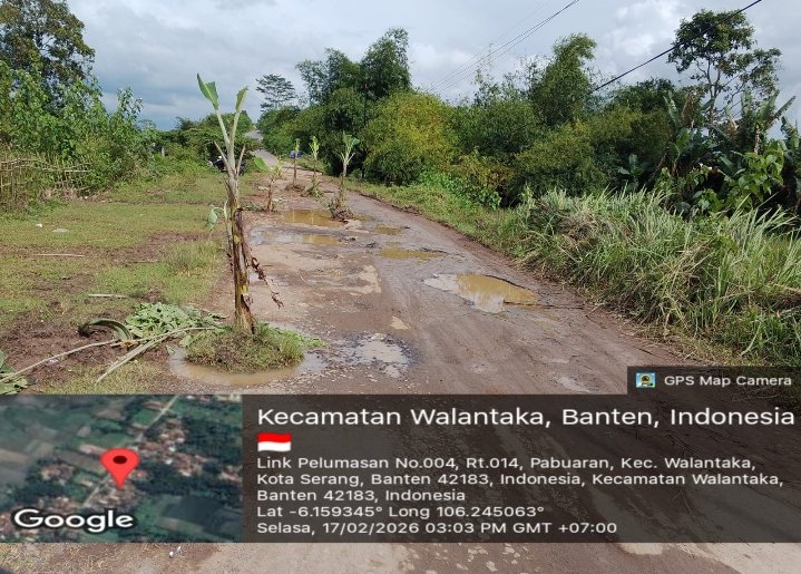 Jalan yang menjadi akses utama masyarakat tersebut tampak berlubang, dipenuhi genangan air, dan semakin parah saat hujan turun. Berdasarkan pantauan di lokasi pada Selasa (17/2/2026) sekitar pukul 15.03 WIB, permukaan jalan terlihat tidak rata dan dipenuhi lumpur. Sejumlah lubang cukup dalam tertutup air sehingga membahayakan pengendara roda dua maupun roda empat.