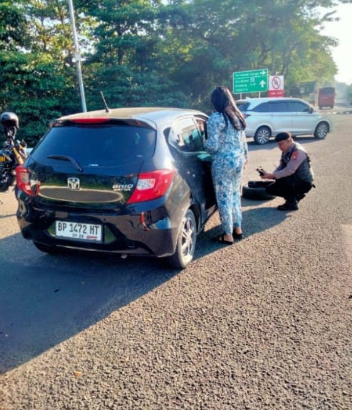 Melihat kondisi sang ibu dalam kondisi sedang hamil dan kendaraannya tak bisa berjalan, kata Reksen, pihaknya langsung membantu dengan menggantikan ban menggunakan roda cadangan yang tersedia di mobil tersebut.