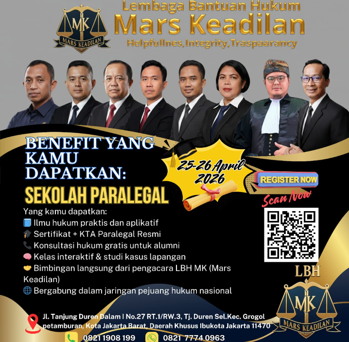 JAKARTA, 25 Maret 2026 .GLOBALWIJAYA.COM.– Lembaga Bantuan Hukum (LBH) Mars Keadilan (MK) secara resmi mengumumkan pembukaan pendaftaran Sekolah Paralegal 2026. Program pendidikan hukum rakyat ini dirancang khusus untuk mencetak agen perubahan yang tangguh dan mampu memberikan pendampingan hukum mandiri bagi masyarakat luas.
